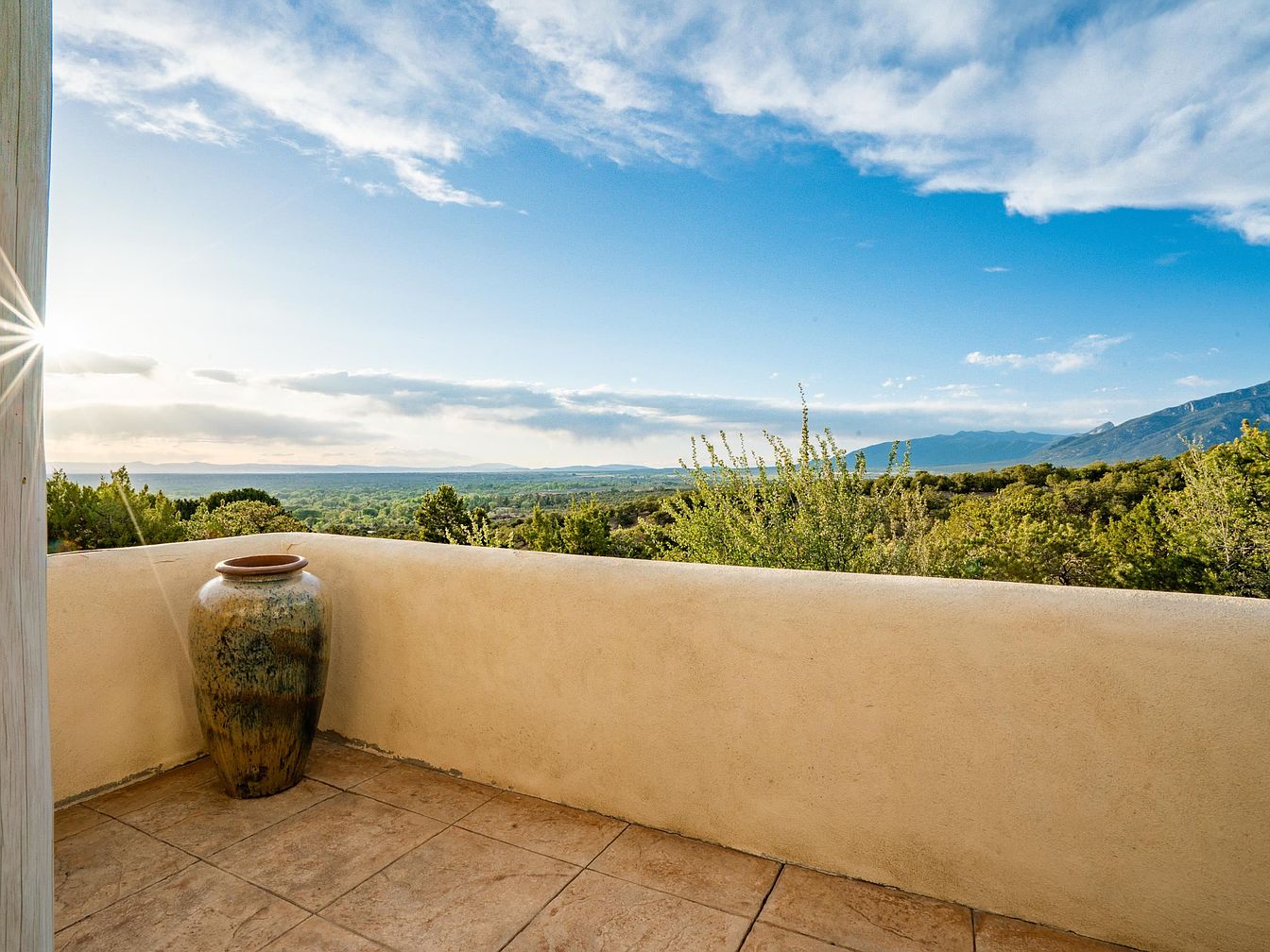 This intimate balcony offers a serene outdoor retreat, featuring warm, earth-toned stucco walls that complement the natural landscape. The tiled floor echoes rustic charm with subtle variations in color and texture, enhancing the overall southwestern aesthetic. A tall, glazed ceramic vase in muted greens and browns adds a sculptural touch and anchors the space. Expansive views stretch across lush greenery to distant mountains under a partly cloudy sky, inviting relaxation and connection with nature. The soft sunlight filtering through the corner amplifies the peaceful and open atmosphere of this elevated vantage point.