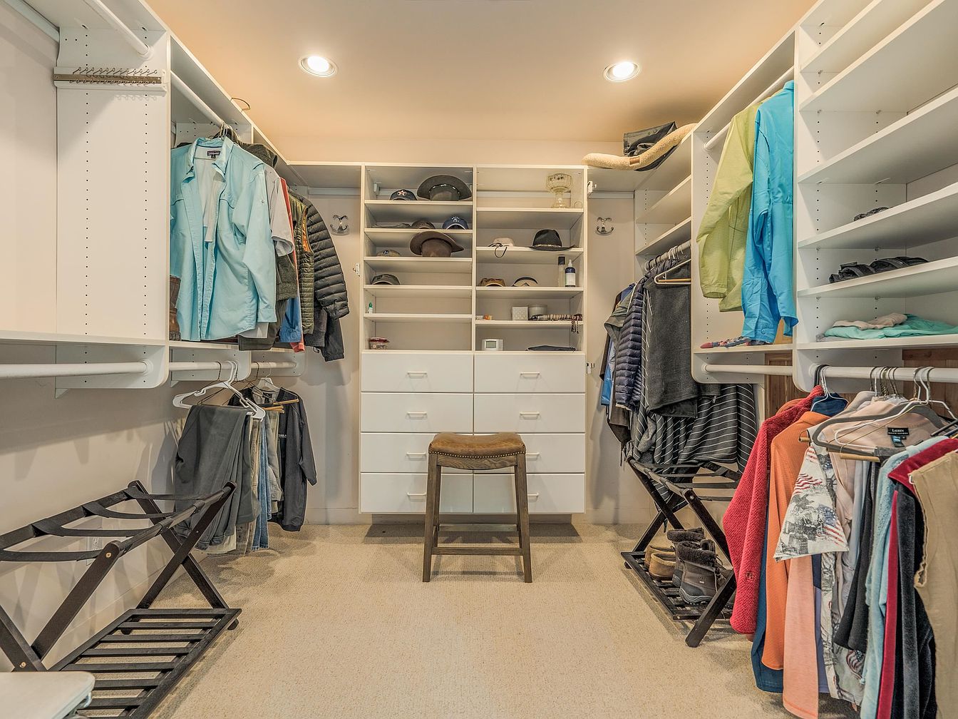 This spacious walk-in closet features a well-organized, symmetrical layout with white built-in shelving and drawers on all three walls. Double hanging rods maximize clothing storage, while open shelves hold hats and accessories neatly arranged above the drawers. A low, wooden stool with a leather seat stands centered for convenience. The carpeted floor adds warmth and softness underfoot. Neutral tones of beige carpet and white cabinetry create a clean, bright atmosphere, complemented by recessed ceiling lights that evenly illuminate the space, balancing functionality with a minimalist, inviting aesthetic.