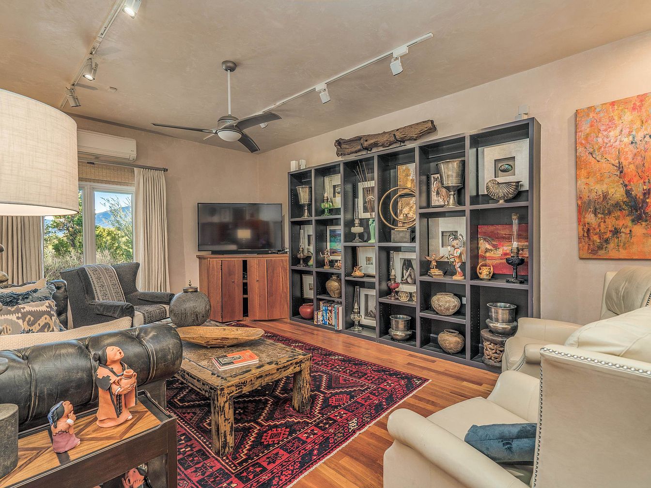 This cozy living room combines rustic and contemporary elements, featuring warm wood flooring and a deep red patterned rug that anchors the space. A distressed wooden coffee table sits centrally, surrounded by a mix of leather and fabric seating, including a cream armchair and a dark cushioned couch. The far wall is dominated by a large, black open shelving unit filled with eclectic decorative items and art pieces, adding character and depth. Natural light filters through the windows draped with neutral curtains. A ceiling fan and track lighting provide both function and ambiance.