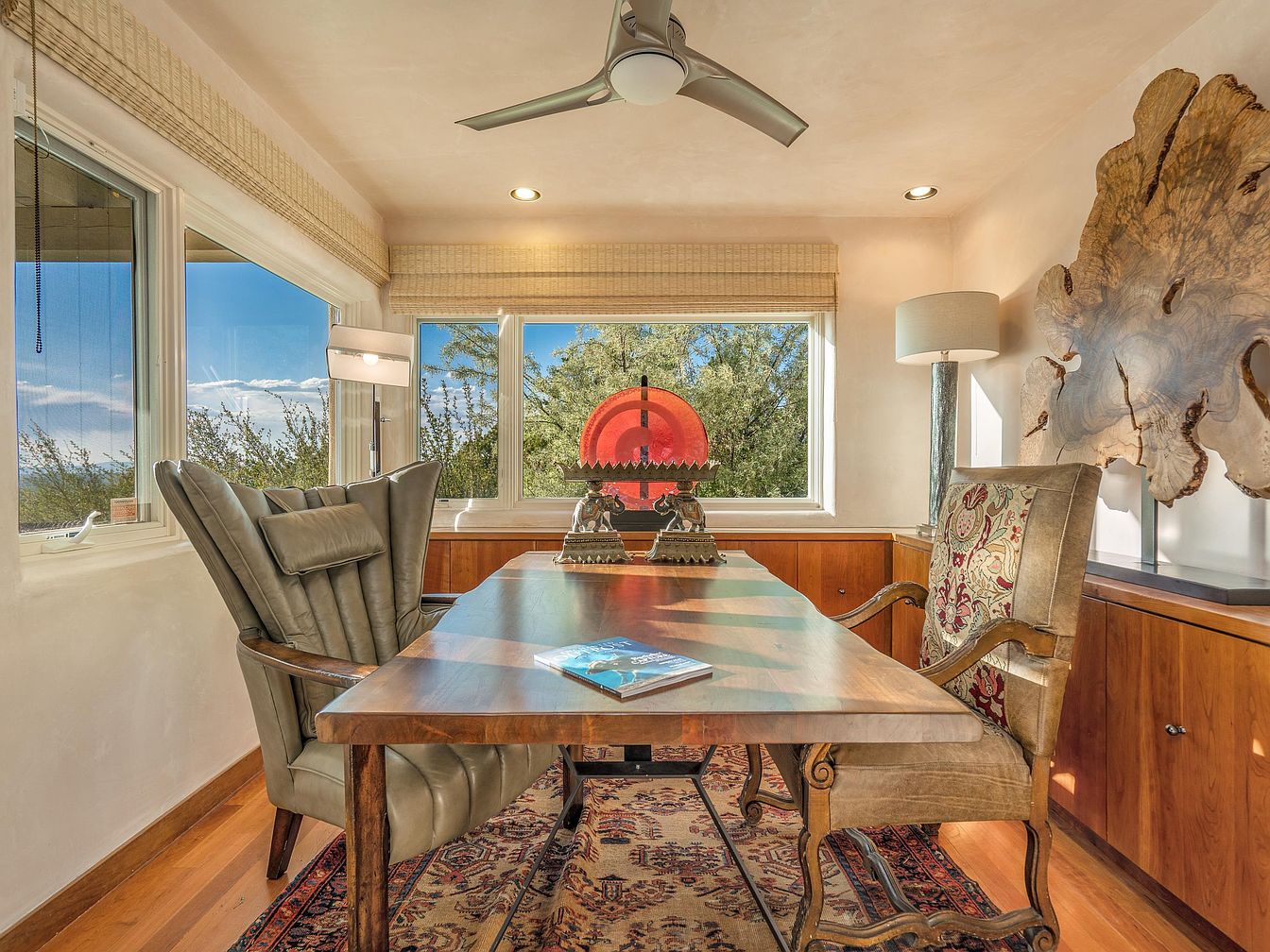 This intimate home office features a wooden desk centered beneath a sleek ceiling fan that adds a modern touch. Plush chairs, one upholstered in a floral pattern and the other in smooth leather, frame the desk, creating a comfortable workspace. A large, decorative wood slab mounted above the built-in cabinets on the right adds natural artistry. Sunlight floods the room through wide windows with woven window treatments, offering lush green views outside. Rich hardwood floors are softened by an ornate rug beneath the desk, blending classic elegance with rustic charm in a warm, inviting atmosphere.