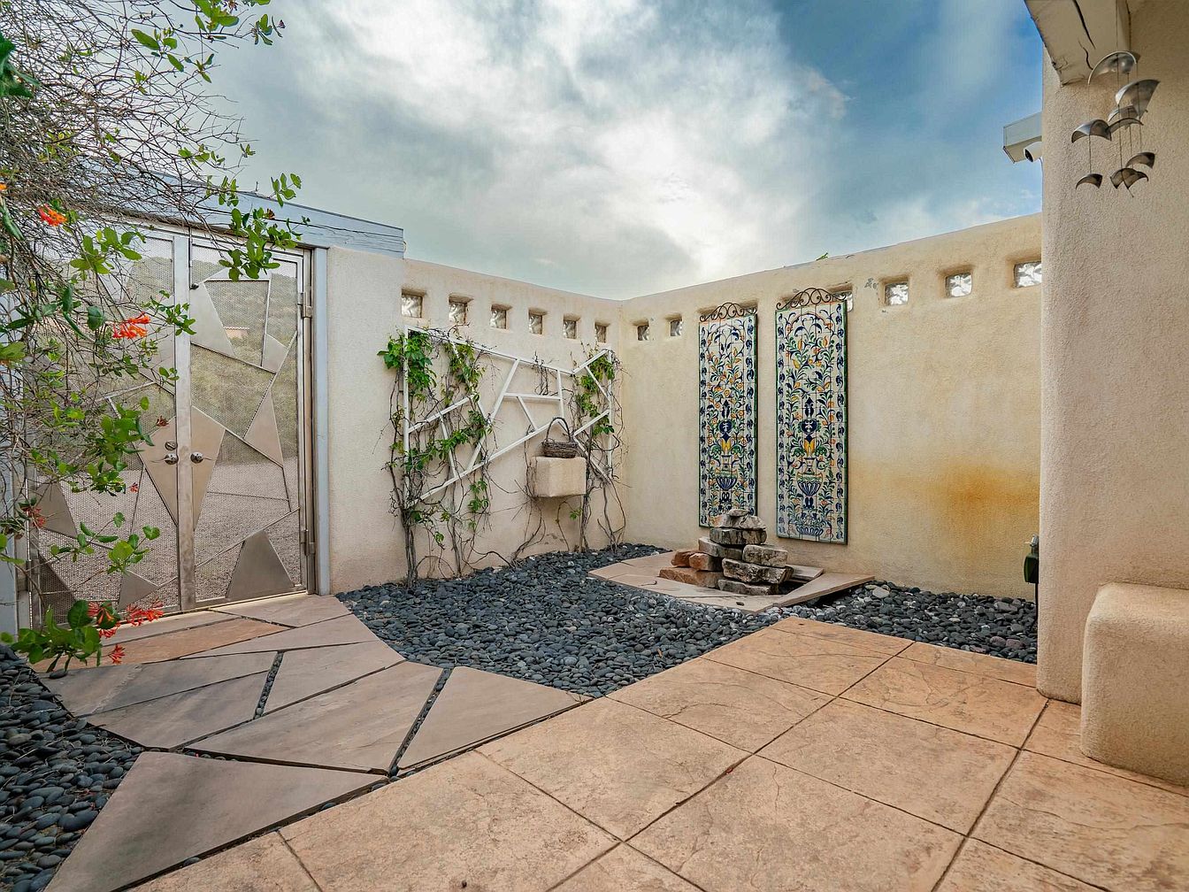 This serene courtyard combines southwestern adobe-style architecture with modern artistic touches. A pathway of large, irregular stone slabs leads to a decorative metal gate with geometric patterns. The courtyard floor is a mix of warm beige tiles and smooth black river stones, creating texture contrast. Climbing vines trace a white, angular trellis on the stucco wall, adding natural greenery. Central to the space is a minimalist water feature made of stacked stone blocks placed on a tiled basin. Two vibrant, hand-painted ceramic tile panels adorn the wall, infusing color and intricate floral designs. The space offers a quiet, contemplative outdoor retreat.