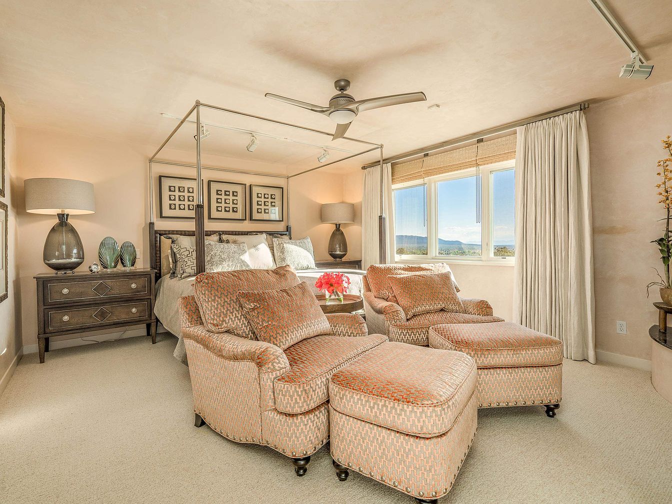 This master bedroom combines comfort and elegance with its soft neutral walls and beige carpeting. A four-poster bed anchors the space, flanked by matching dark wood nightstands topped with large, translucent glass lamps. The bed is adorned with multiple patterned and textured pillows that add subtle sophistication. Two plush armchairs and ottomans in warm, muted orange upholstery face a large window, inviting relaxation while taking in the scenic view beyond. Natural light floods the room through the expansive windows, complemented by heavy cream-colored drapes and woven shades. A ceiling fan with modern blades provides a sleek functional accent above.