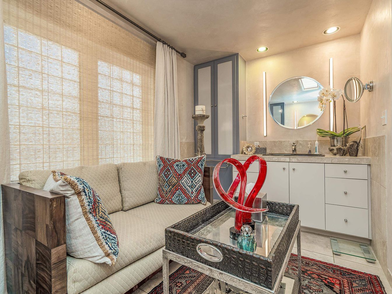 This unique bathroom blends relaxation and functionality with its cozy seating area, featuring a beige quilted sofa accented by vibrant patterned throw pillows. Natural light filters through woven shades, softening the space and complementing the neutral-toned walls and tile flooring. Opposite the sofa, a modern vanity with white cabinetry and a circular mirror flanked by vertical LED lighting creates a sleek yet inviting atmosphere. The wicker tray atop the clear table introduces texture and holds eye-catching red artistic decor, infusing the area with color and personality. Built-in storage cabinets in muted gray enhance the room’s clean lines and practical design.