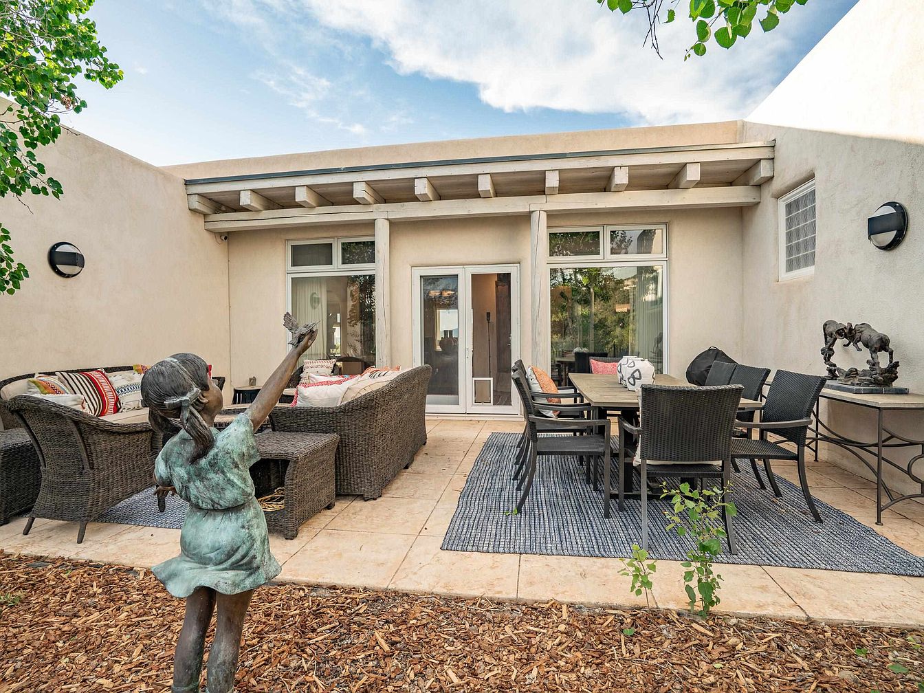 This serene outdoor patio features a natural stone tiled floor bordered by a wood mulch garden bed with a whimsical bronze statue of a girl releasing a bird. The seating area is furnished with dark brown wicker sofas adorned with colorful patterned cushions, creating a warm and inviting atmosphere. Adjacent to the lounge space, a rectangular dining table with matching chairs rests on a blue patterned outdoor rug, perfect for al fresco meals. Soft beige stucco walls enclose the space, enhanced by rustic timber beams overhead and large windows that connect indoors and outdoors, blending comfort with Southwest charm.