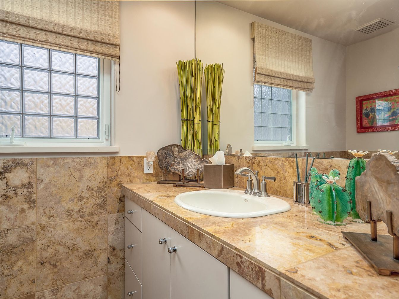 This bathroom vanity features a warm, natural color palette dominated by beige and earthy tones in the marble countertop and tiled backsplash. White cabinetry with simple chrome knobs offers clean storage beneath the countertop. Two frosted glass block windows flank the vanity, allowing soft natural light while maintaining privacy, each adorned with woven bamboo shades adding texture. A large mirror stretches above, enhancing the sense of space. Decor includes tall, slender green bamboo stalks in the corner, a set of decorative green cactus objects, and natural stone sculptures, contributing subtle organic elements and visual interest.