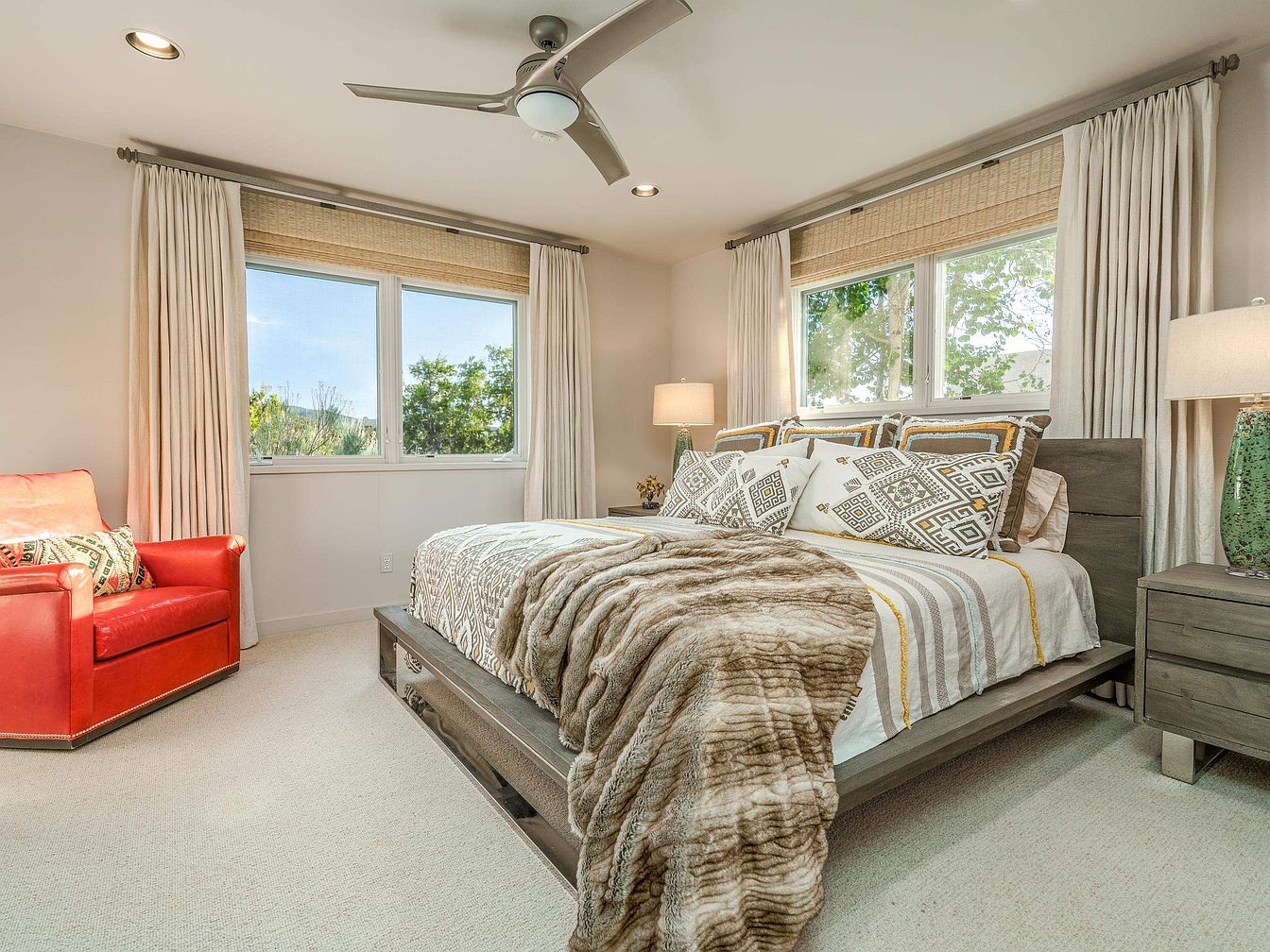 This master bedroom features a tranquil and warm ambiance characterized by neutral-colored walls and light carpeting that enhances the airy atmosphere. The focal point is a dark wood platform bed adorned with geometric-patterned bedding in earth tones, topped with a lush faux fur throw for a cozy touch. Large windows with woven shades and creamy drapery provide soft, natural light and pleasant outdoor views. A striking red leather armchair offers a bold splash of color, contrasting elegantly with the otherwise muted palette. Nightstands with green ceramic lamps add texture and subtle charm, while the modern ceiling fan completes the room’s sophisticated yet inviting design.