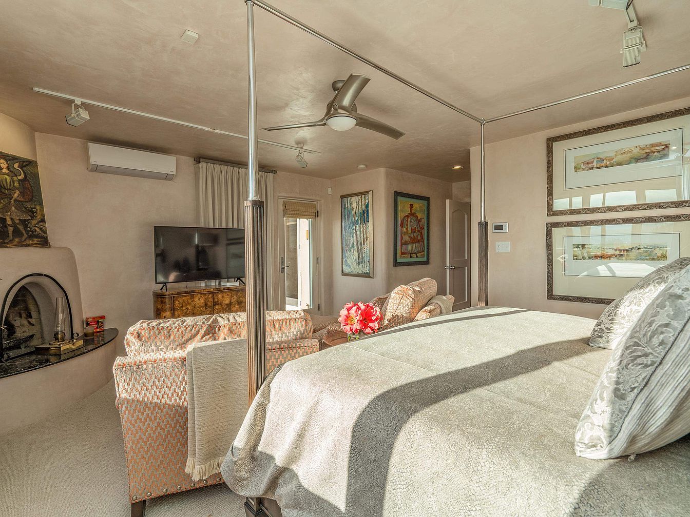 This master bedroom features a sophisticated palette of warm neutrals with soft beige walls and carpeting that complement the textured bedding on the four-poster bed. Adjacent to the bed is a cozy seating arrangement with patterned armchairs facing a flat-screen TV atop a vintage wooden console. A kiva-style fireplace with a smooth rounded edge adds Southwestern charm and warmth. The room is accented by various artworks framed in dark wood, and there are ample light sources including ceiling track lights, a sleek ceiling fan, and natural light streaming through a glass door covered by a light curtain. The overall feel is inviting, blending modern comfort with artistic and regional influences.