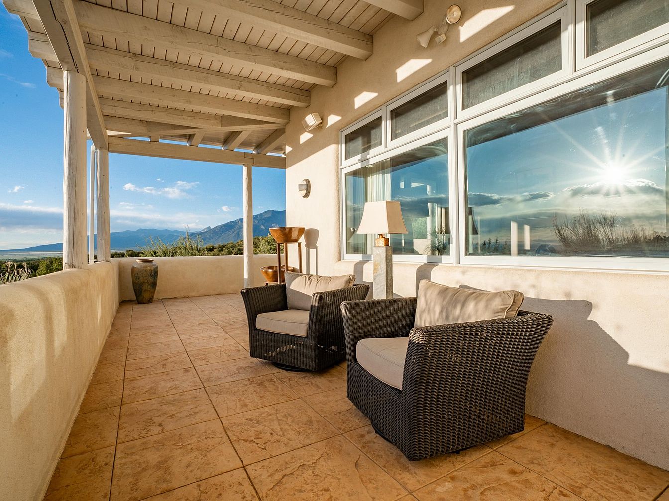 This spacious covered patio invites relaxation with its warm earthy tones and textured tile flooring. The ceiling features exposed wooden beams painted white, adding a rustic yet refined architectural touch. Soft beige plaster walls blend harmoniously with the outdoor environment, enhancing the natural aesthetic. Two cushioned wicker armchairs face outward, positioned perfectly for enjoying the stunning mountain view and expansive sky. A standing floor lamp and accents like a large ceramic vase and wooden baskets provide subtle decor. Large windows along one wall reflect the vibrant sunlight, creating a serene indoor-outdoor connection and flood the adjacent interior space with natural light.