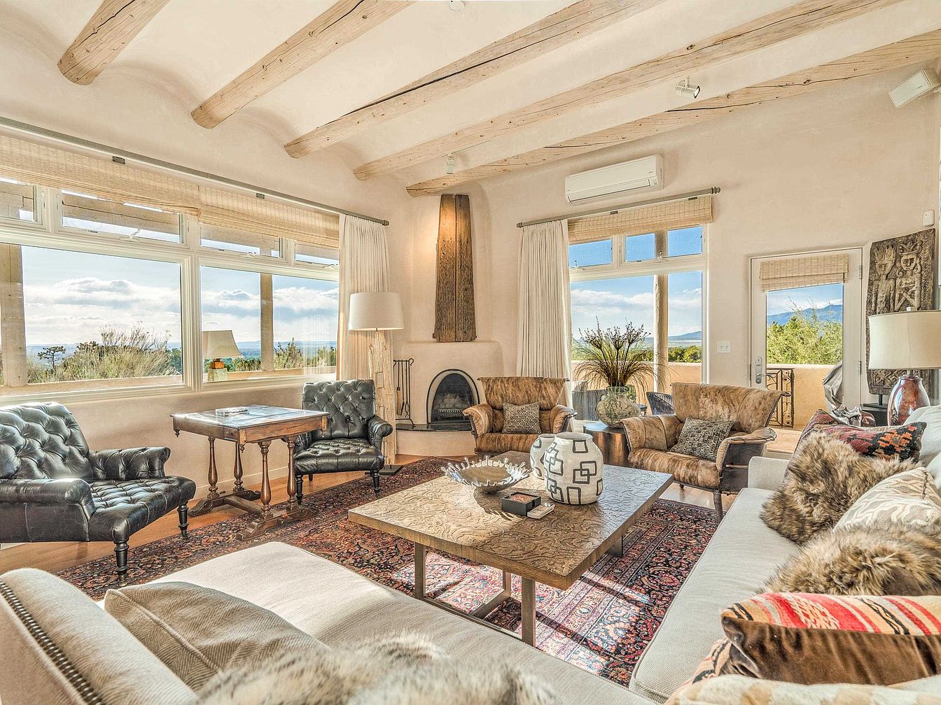 This spacious living room captures a warm, inviting atmosphere with its blend of rustic and elegant aesthetics. The ceiling features natural wood beams contrasting softly with the smooth, light-toned plaster walls, evoking a Southwestern charm. Large windows draped with light woven shades frame stunning outdoor views, inviting abundant natural light. Classic deep tufted leather chairs and cozy textured armchairs encircle a low, intricately patterned coffee table resting on a richly colored oriental rug, grounding the room. A stucco fireplace with a vertical wooden accent creates a focal point, complemented by tasteful decorative vases and plush pillows adding texture and warmth.