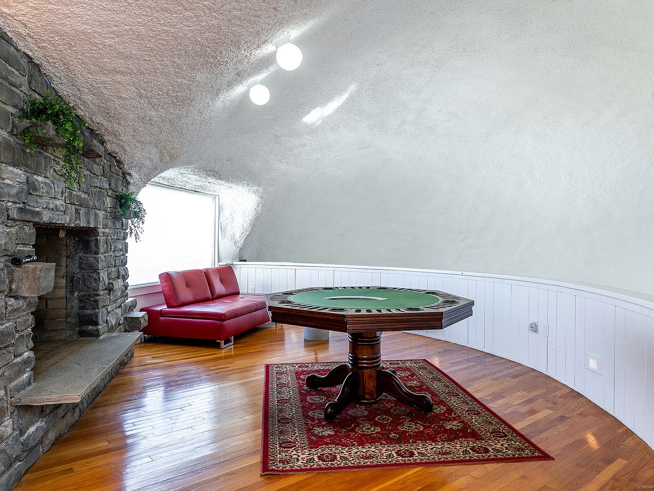 This inviting game room features a curved, cave-like white plaster ceiling that adds unique architectural interest. The smooth, rounded walls converge with white vertical paneling which lines the lower half of the room, creating a clean, bright backdrop. A rich, dark stone fireplace brings textural contrast and rustic charm, complemented by small touches of greenery. The warm honey-toned hardwood flooring enhances the room’s cozy feel, while a traditional patterned red rug anchors a large octagonal wooden table, perfect for cards or board games. A sleek red leather loveseat sits adjacent to a large window, inviting natural light and offering a comfortable spot to relax.