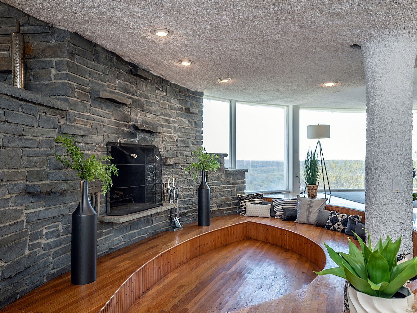 This cozy living room corner centers around a striking stone fireplace wall that brings rustic charm to the modern space. A built-in curved wooden bench hugs the fireplace, adorned with an assortment of neutral-colored throw pillows in geometric and striped patterns for added comfort and style. The ceiling features small recessed lights that softly illuminate the room, contrasting with the rugged texture of the white stucco pillar near the seating area. Large wraparound windows fill the room with natural light and offer expansive views outside, creating an inviting spot for relaxation. Tall black vases with green foliage add a touch of organic elegance.