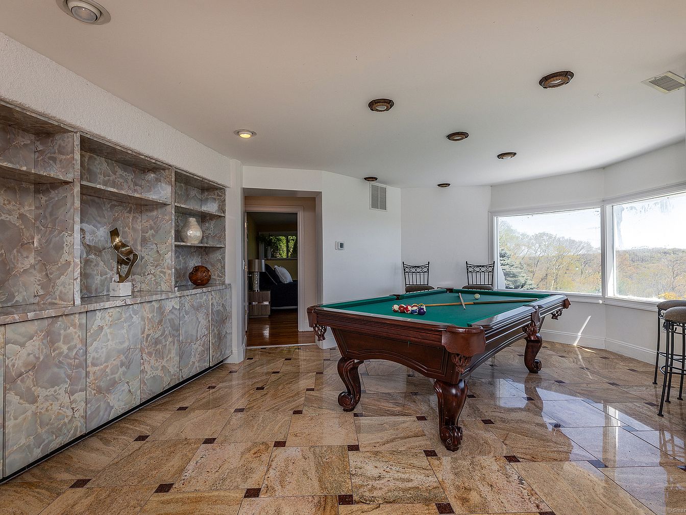 This inviting game room centers around a classic wooden pool table with green felt, providing a focal point for entertainment. The room features glossy stone flooring with a warm beige and brown pattern, accented by small dark square tiles, which complements the marble-like built-in shelving and cabinetry on one wall. The shelving holds subtle decorative pieces, adding a touch of elegance. Large, panoramic windows flood the space with natural light while framing a scenic outdoor view. White walls and ceiling punctuated by recessed lighting complete the clean, sophisticated aesthetic. Two wrought-iron chairs and a tall barstool suggest social seating options, emphasizing comfort and leisure.