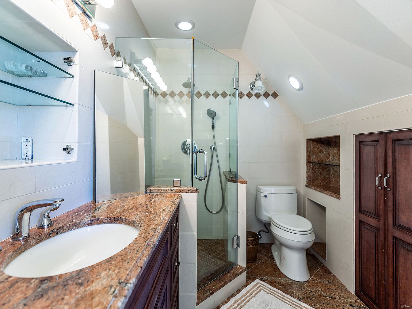 This bathroom corner features a compact yet elegant layout with a glass-enclosed shower that maximizes visibility and space. The walls and floor are clad in warm-toned brown and beige tiles, accented by a diamond-patterned border that adds visual interest. The vanity showcases a rich granite countertop with an undermount sink and a chrome faucet, paired with dark wooden cabinetry that provides ample storage. A modern toilet is positioned adjacent to a built-in recessed niche, perfect for toiletries. Skylights above add natural light, enhancing the room’s bright and clean aesthetic.