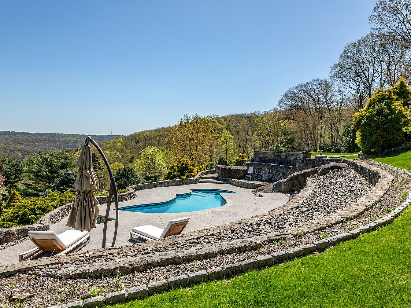 This serene outdoor space features a uniquely shaped pool surrounded by a broad concrete deck, ideal for lounging and sunbathing. Two cushioned wooden lounge chairs face the pool, next to an umbrella stand holding a folded umbrella. Stone retaining walls and terraced landscaping using smooth river rocks create natural boundaries, integrating the pool area seamlessly into the hillside terrain. The vibrant green manicured lawn contrasts beautifully with the natural stone and subtle earth tones of the deck. The backdrop of rolling wooded hills under a clear blue sky adds an expansive, tranquil atmosphere to this elegant backyard retreat.