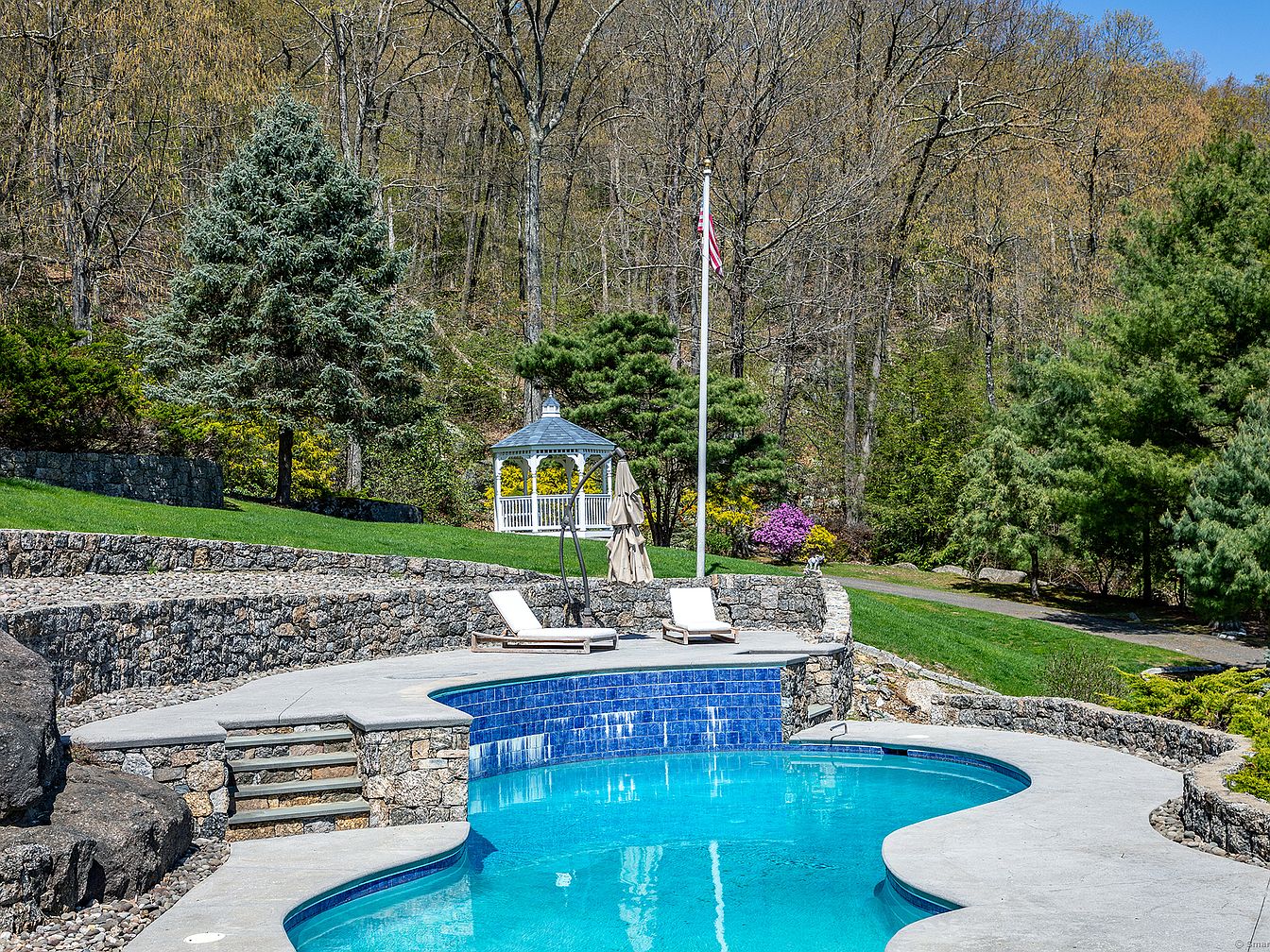 This serene outdoor space features a uniquely shaped swimming pool surrounded by a smooth concrete deck. The pool is set against a backdrop of multi-tier stone retaining walls, adding structural interest and natural texture. Adjacent to the pool, two white cushioned lounge chairs invite relaxation, positioned for optimal sun exposure. Steps lead up to a lush grassy area bordered by well-maintained shrubbery and tall trees, offering privacy and a natural ambiance. A charming white gazebo stands as a focal point beyond the pool, surrounded by vibrant flowering bushes and mature trees, creating a peaceful garden retreat.