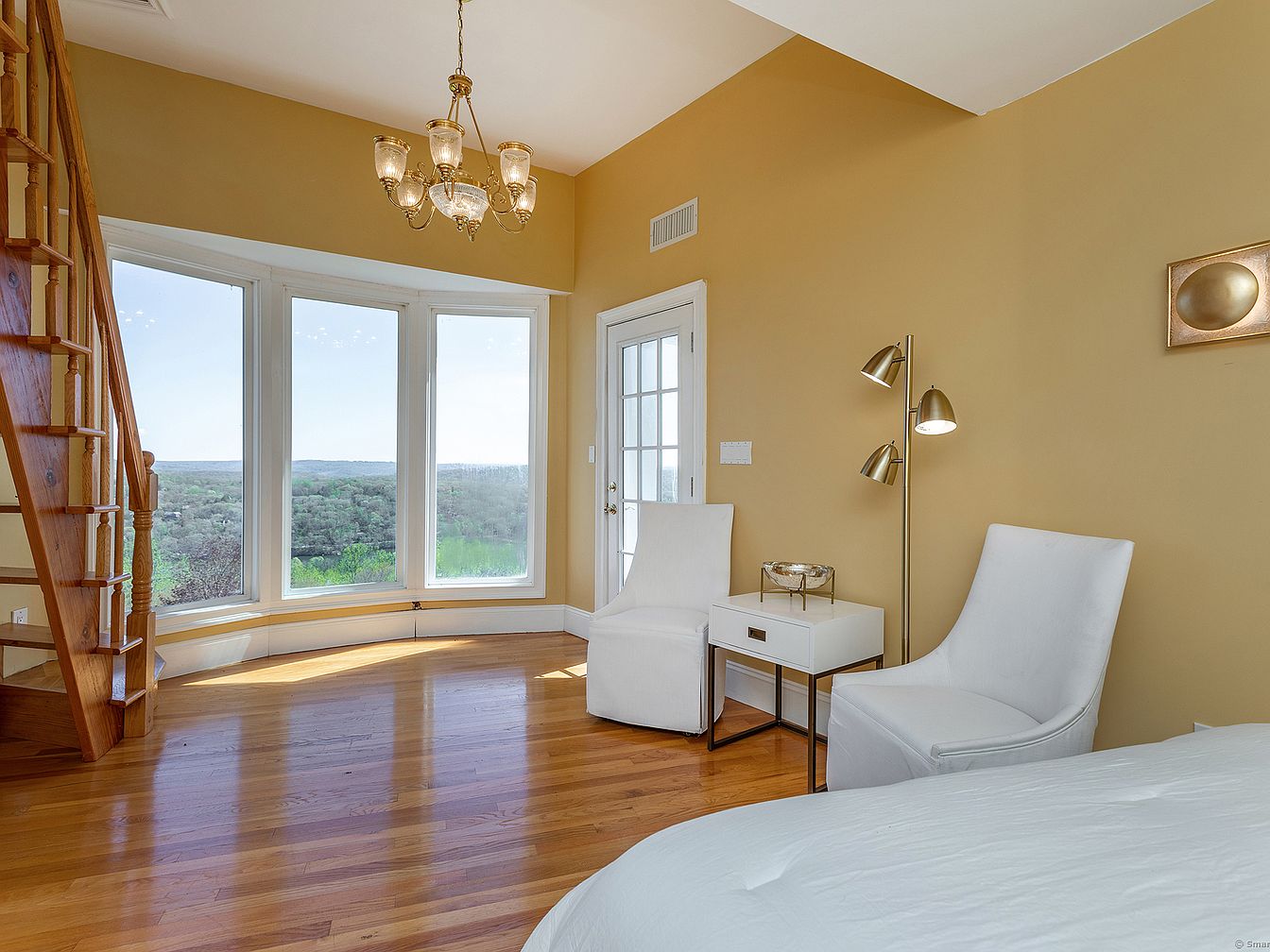 This tranquil bedroom corner features warm golden-yellow walls contrasted by rich, honey-toned hardwood flooring that adds an inviting natural glow. A curved bay window offers panoramic views of a lush green landscape, bathing the room in soft natural light. Two elegant white upholstered chairs flank a modern white side table, designed with clean lines and a small drawer. A sleek, adjustable brass floor lamp provides focused lighting, complementing the brass chandelier which adds a touch of classic sophistication. A wooden staircase on the left adds texture, while a glass-paneled door leads to an outdoor area or balcony, enhancing the airy, open feel of the space.
