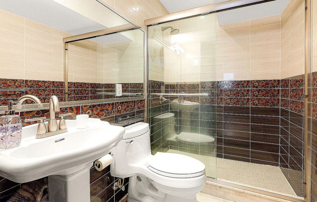 The bathroom combines warm beige tones with striking patterned tile accents for a unique, modern look. The glass-enclosed shower features a mix of glossy and matte finishes, adding depth and contrast. A pedestal sink and sleek brushed-nickel faucet provide a classic touch, while a large mirror enhances the sense of space. Recessed lighting and a well-placed vanity light fixture ensure the room is bright and inviting, balancing functionality with eye-catching design elements.