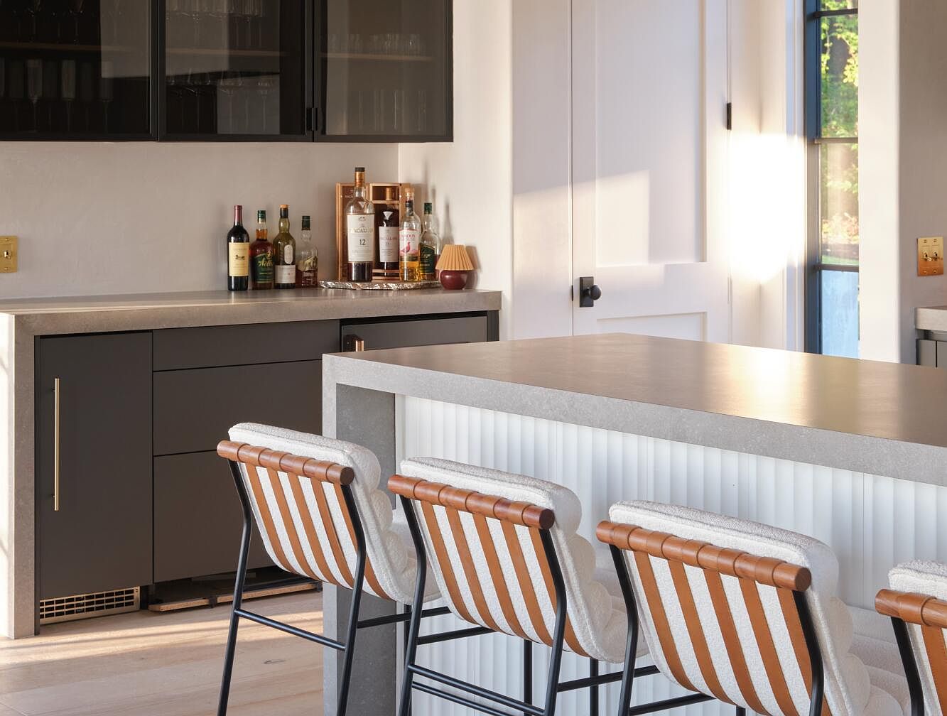 This contemporary kitchen bar merges sleek design with family-friendly function. The counter sports a gray stone surface, paired with deep black cabinetry offering ample storage. Bar stools with striped patterns provide comfortable seating, inviting guests to gather. Cabinetry features subtle glass doors for easy display of glassware and curated spirits. Natural light streams in through large windows, highlighting the clean lines and architectural details that create an airy ambience. A refined space that balances sophistication with warmth, perfect for entertaining or casual family meals.
