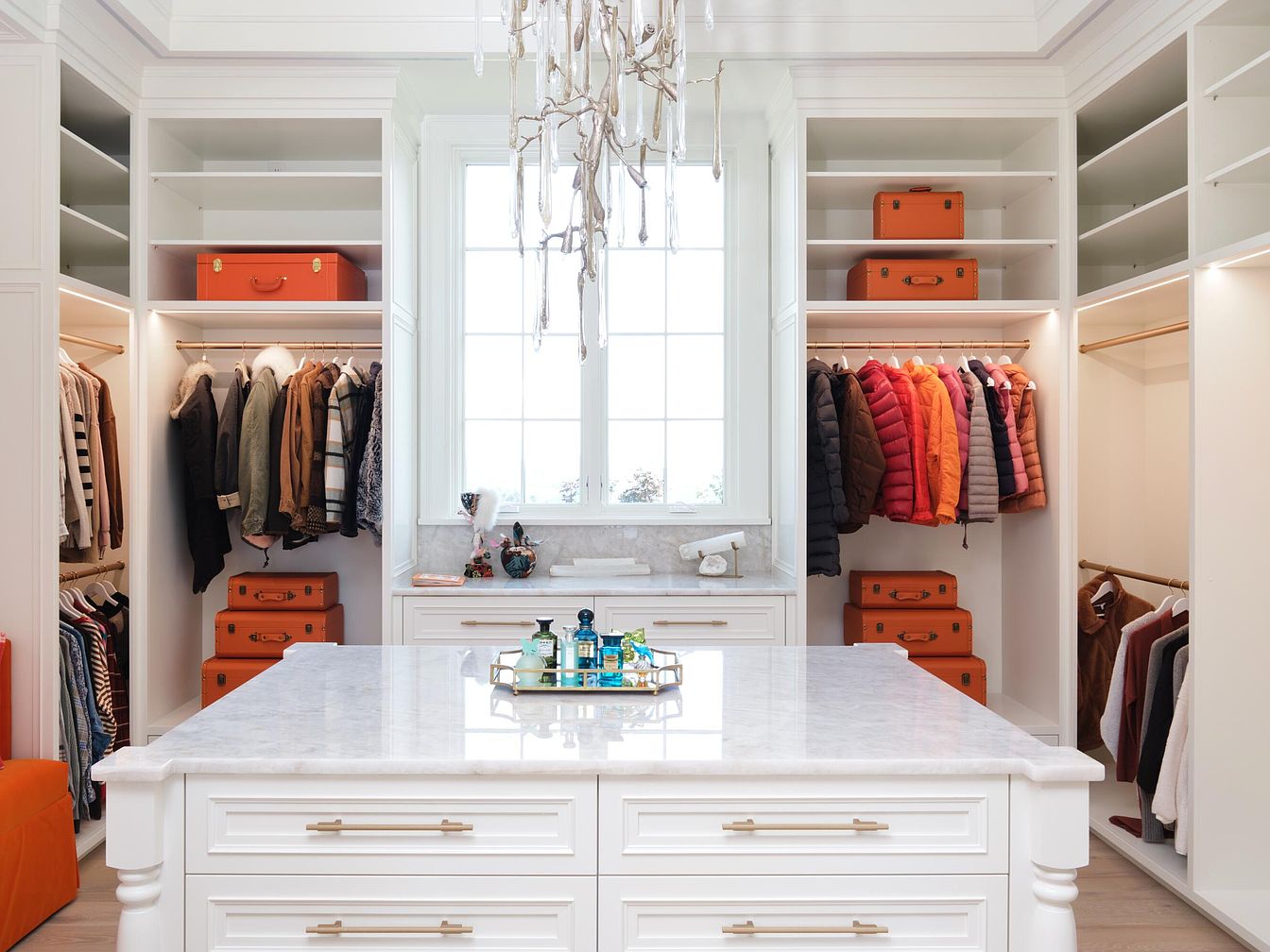 This walk-in closet showcases a seamless blend of utility and luxury, featuring a spacious island countertop in polished marble. Bright white cabinetry enhances the airy feel, while organized shelves display clothing, including vibrant jackets that add personality. Elegant lighting creates a warm mood, and orange-toned suitcases provide a playful contrast. Ample shelving and hanging space offer practicality, keeping daily routines tidy and stylish for the whole family.