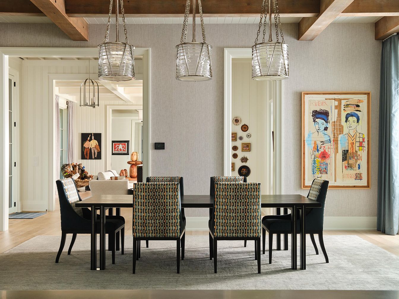 This dining room merges modern sophistication with warmth, featuring a generous layout that encourages family gatherings. A black dining table anchors the space, surrounded by distinctive patterned chairs that introduce color and visual interest. Walls in neutral tones are offset by textured wallpaper and wood beams overhead, creating a welcoming ambience. Artwork and wall hangings add a personal touch. Two hanging glass pendant lights provide practical illumination while enhancing the overall aesthetic, rendering this area ideal for casual family meals or formal entertaining.