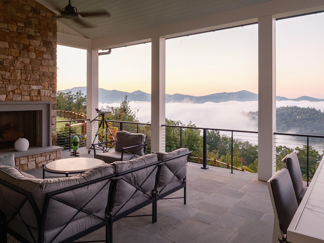 The outdoor patio seamlessly blends indoor comfort with nature’s splendor. A cozy seating area with plush gray cushions invites relaxation while enjoying dramatic mountain vistas. A rustic stacked-stone fireplace provides warmth for cool evenings with family. The open design is complemented by sleek railings that maximize airflow and views. A quaint dining setup invites meals beneath the sky, and decor elements like a telescope encourage outdoor exploration. The palette of grays and soft earth tones harmonizes with the surrounding landscape, creating a peaceful retreat.