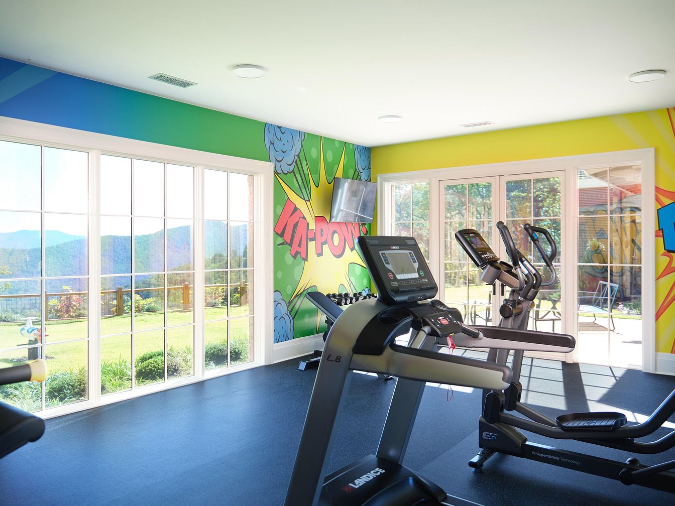 A vibrant home gym designed to energize the household features colorful comic-style wall art, boosting the playful mood. Large windows present panoramic views of lush surroundings, inviting natural light and fresh air. Modern fitness machines, including treadmills and ellipticals, are arranged with practicality in mind while maintaining a welcoming appearance. Durable flooring and a sleek finish suit an active lifestyle. Bright hues integrate seamlessly, encouraging family members of all ages to work out together, making fitness fun and accessible.