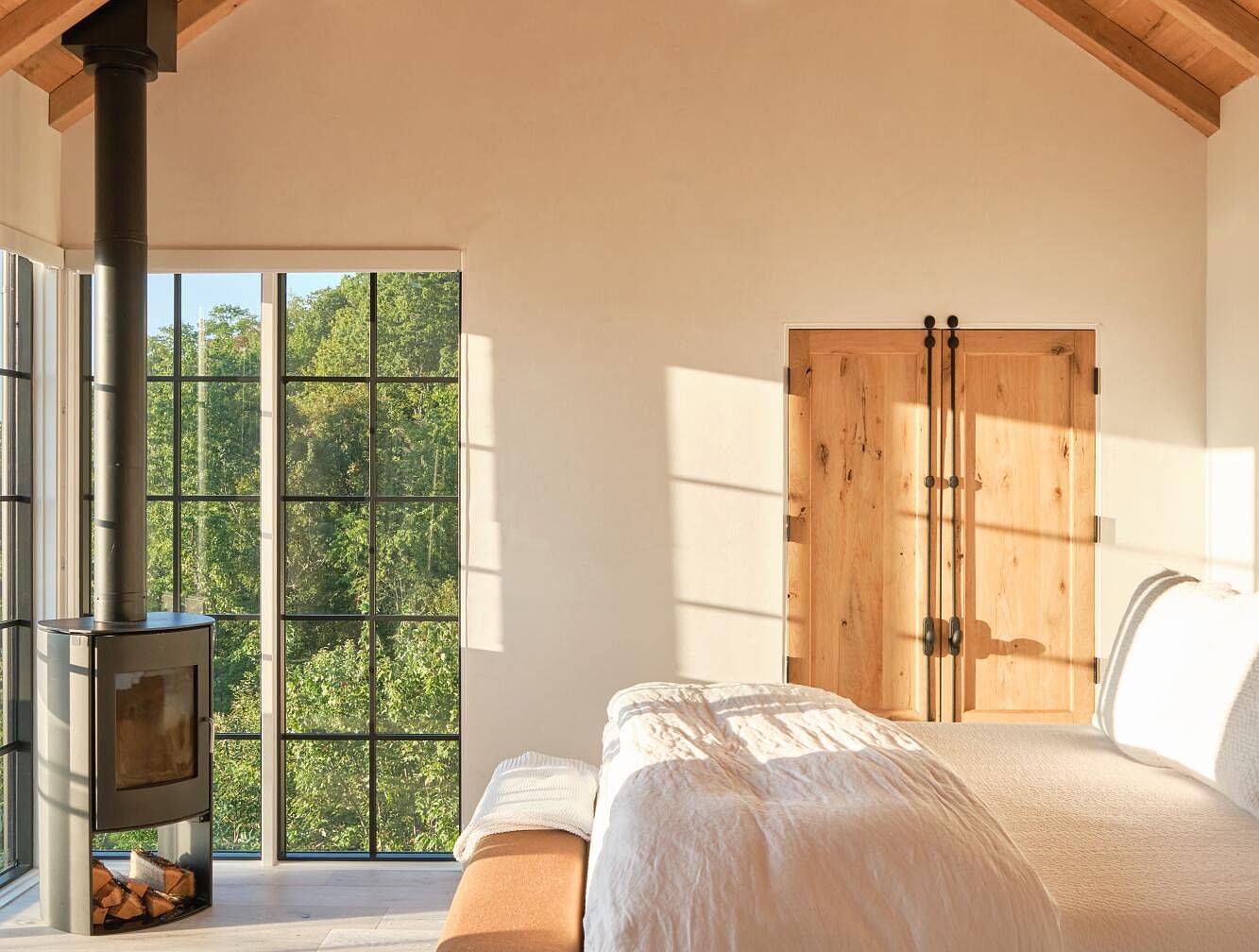 This tranquil bedroom features expansive windows that invite natural light, perfectly framing a lush outdoor view. High ceilings, accented by rustic wooden beams, amplify the sense of space. A modern cylindrical wood stove serves as a striking design element and a cozy heating source, ideal for family gatherings. The inviting color palette combines soft whites and warm wood tones, fostering a sense of calm. The bed, dressed with textured linens, offers comfort, while the double wooden doors with stylish hardware add character and warmth, making this space ideal for relaxation and family bonding.