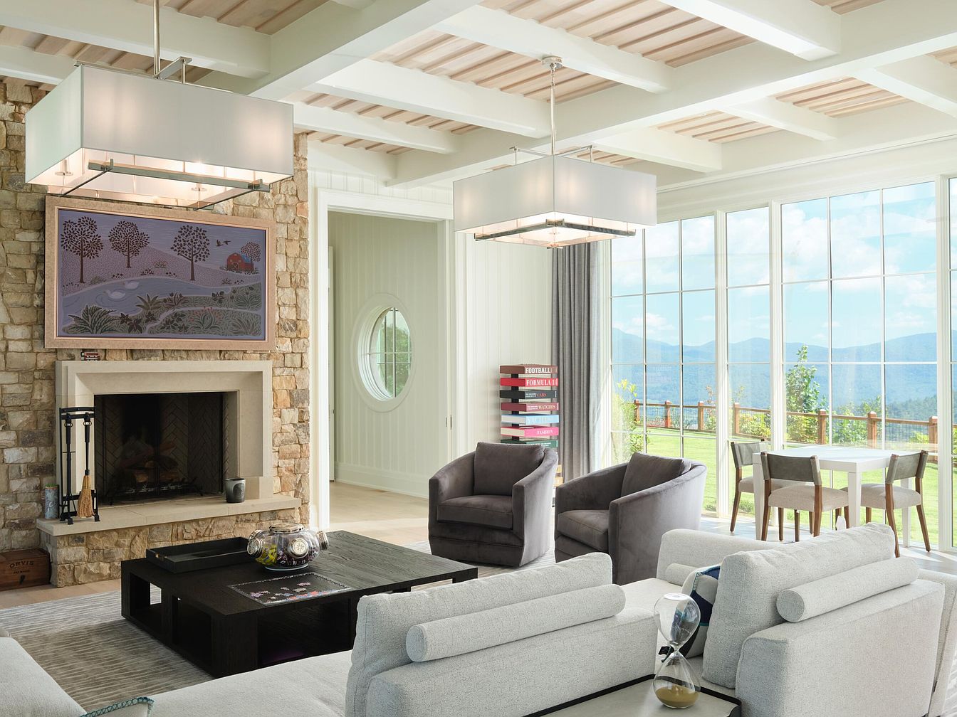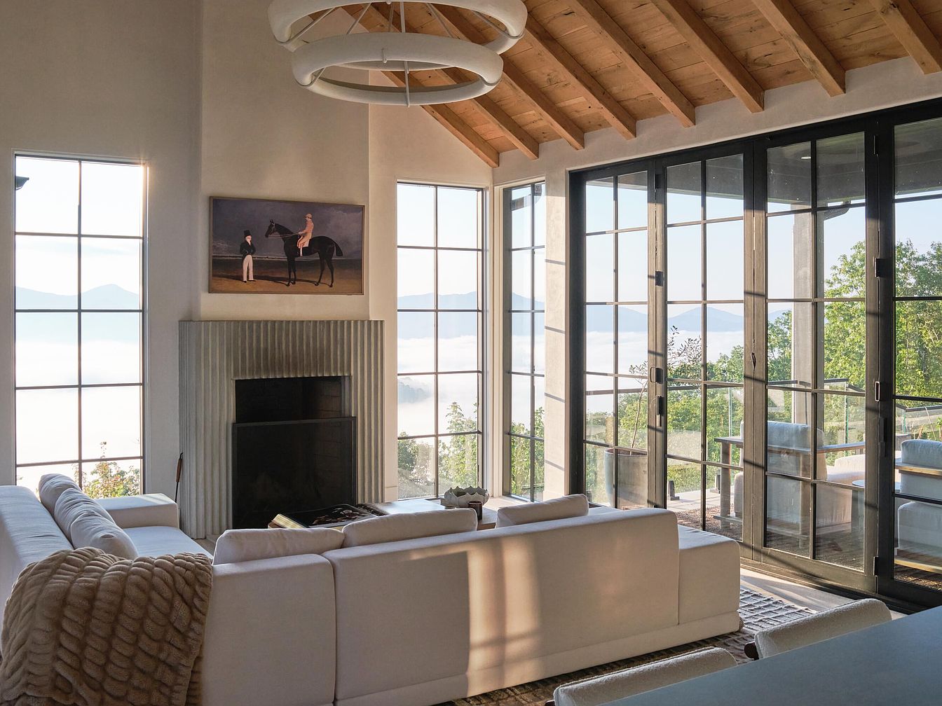 The living room offers a spacious, open layout with high ceilings and exposed wooden beams that add warmth. Large floor-to-ceiling windows flood the space with natural light, presenting views of the surrounding landscape. A modern fireplace framed by textured stone serves as a focal point, with soft neutrals and earthy tones throughout. A plush sectional invites relaxation, and a striking artwork piece adds personality. The space is ideal for entertaining and cozy family moments.