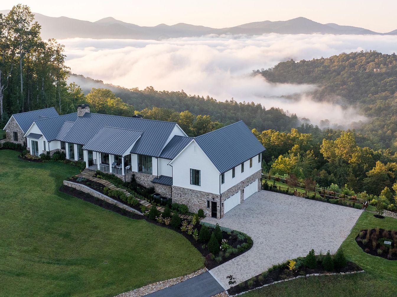 The residence embodies a modern farmhouse vibe, pairing white siding with natural stone accents for a cohesive look. The generous floor plan is bathed in daylight thanks to oversized windows that reveal sweeping mountain vistas and misty valleys. A meticulously maintained lawn and thoughtful landscaping amplify the welcoming mood. The multi-gabled roof adds character while the broad driveway accommodates gatherings, reinforcing a warm, family-friendly atmosphere. From rustic stone details to orderly walkways, every element supports an inviting ambiance ideal for relaxation and entertaining.