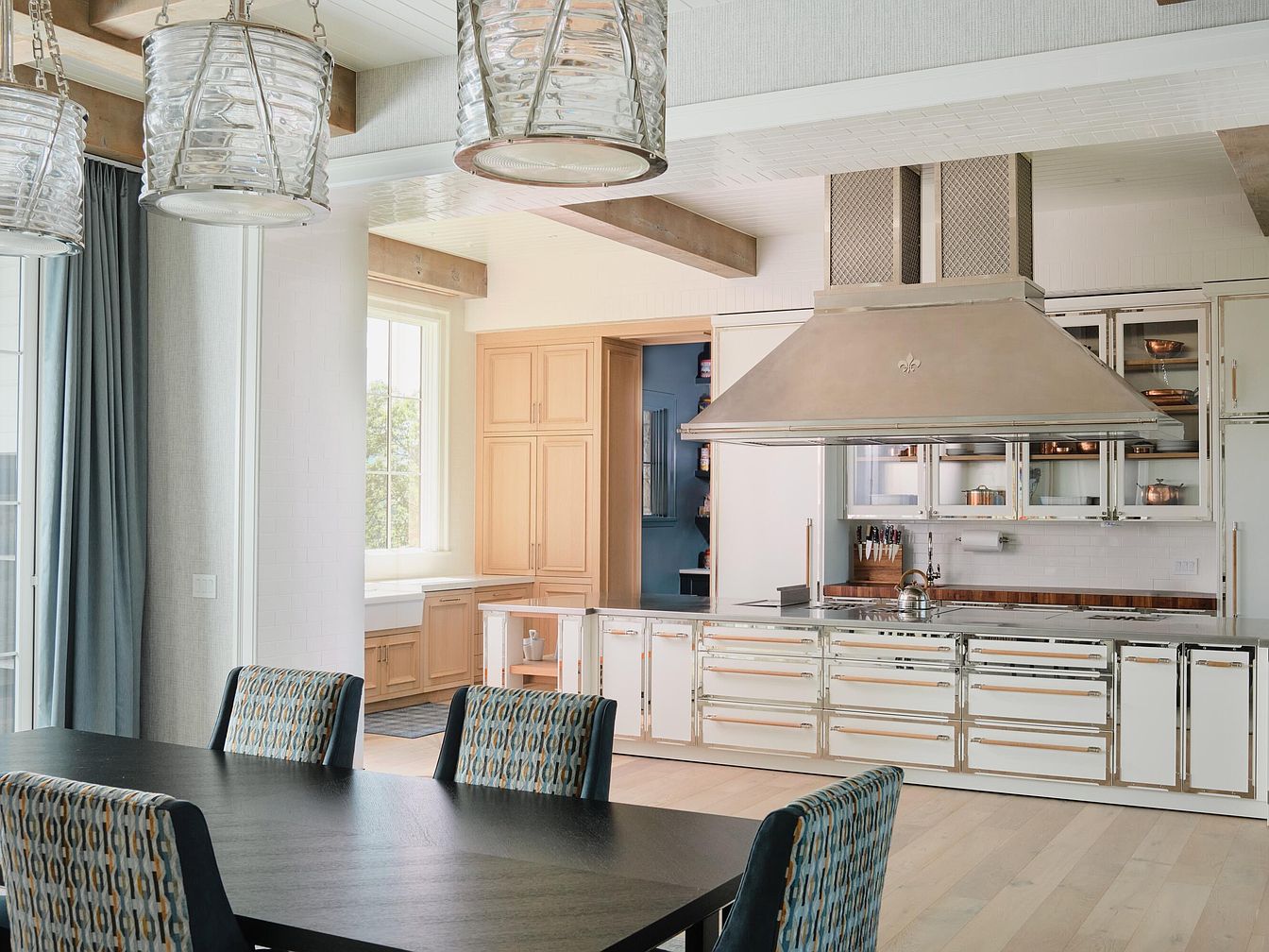 The kitchen blends contemporary aesthetics with practical function. Abundant daylight pours through expansive windows, highlighting the warm tones of oak cabinetry. Stainless-steel appliances, including a professional-grade range, deliver style and efficiency. A generous countertop area enables easy meal prep. Ample storage supports organization, while light wood flooring complements the neutral palette, and chrome accents add a refined touch. This hub is ideal for family gatherings, combining practicality with modern charm.