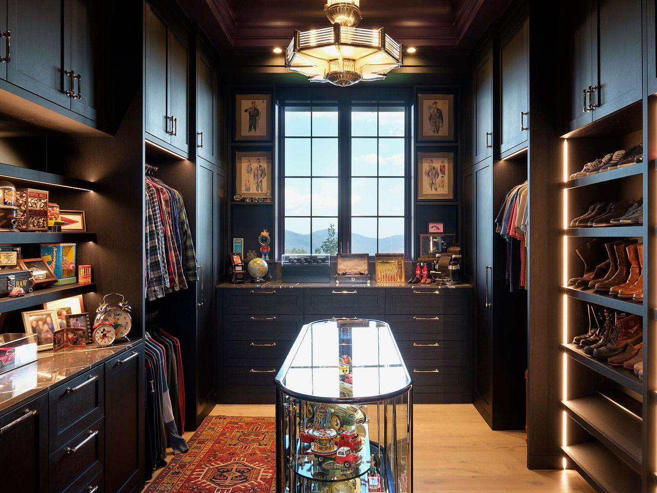 The walk-in closet blends practicality with elegance. Dark cabinetry provides ample shoe storage on illuminated shelves and hanging space for apparel and accessories. A central glass-topped island adds a luxurious touch, perfect for displaying items or organizing belongings. A plush area rug adds warmth, while framed photos and unique memorabilia decorate the walls, creating a personalized atmosphere. Large windows invite natural light, highlighting the rich color scheme. Sleek hardware and refined lighting elevate the space, keeping it both functional and engaging for family members and guests.