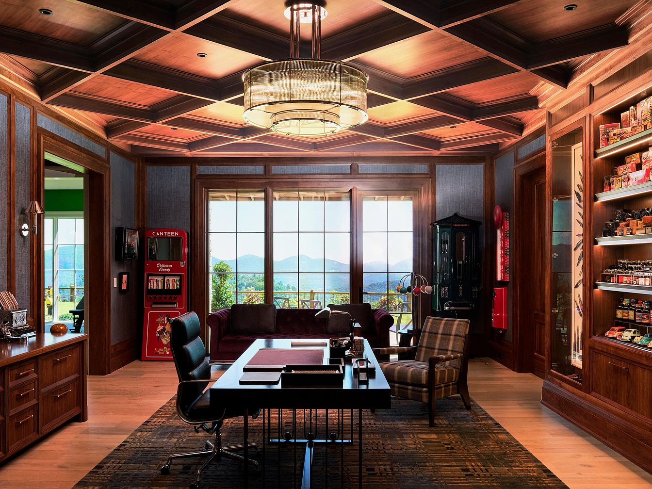 This refined home office blends practicality with style. Rich wooden panels and a coffered ceiling craft a warm atmosphere, complemented by a bold blue wallpaper that adds depth. Large windows frame mountain views, filling the room with natural light. A sleek desk sits at the center, paired with a leather chair and a cozy armchair—ideal for work or reading. Open shelving displays vintage collectibles, while a vintage soda vending machine adds a playful, nostalgic touch, making the space both inspiring and enjoyable for the whole family.
