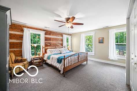 Sunlight pours through three large windows adorning two walls of this spacious bedroom. The floor is covered with soft, light grey carpet, complementing the neutral light beige walls. One wall stands out with its exposed log beams, adding rustic charm to the space. The wooden bed features crisp white and pastel bedding, flanked on one side by a vintage striped armchair and a small side table. A ceiling fan with wooden blades hangs above, providing both function and visual warmth. Sheer white curtains frame each window, creating a bright, airy atmosphere that highlights the room’s blend of classic and cozy aesthetics.