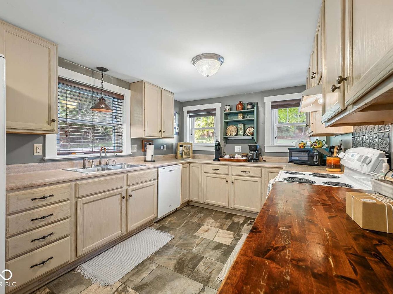 A spacious kitchen featuring a warm, rustic atmosphere with light wood cabinetry and vintage metal hardware. The countertops are divided between a light laminate and a darker, glossy butcher-block stretch beside a white electric stove. Slate-colored tile flooring adds texture underfoot. Multiple windows and a hanging pendant lamp fill the room with natural light, while a decorative open shelf between two windows displays colorful dishes and keepsakes. Neutral walls with white trims frame each window, enhancing the historic charm. Functional elements like a double sink, dishwasher, microwave, and coffee station are neatly integrated for convenience and style.