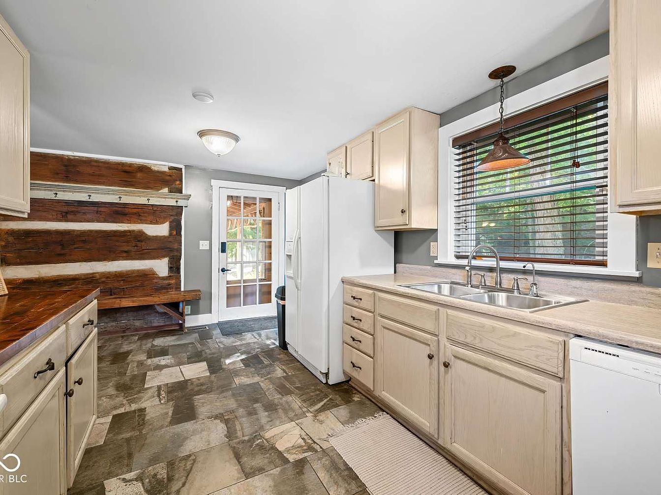 A bright kitchen with a balance of rustic and modern touches. Light beige cabinetry with dark hardware lines the walls, complemented by a neutral marble-patterned tile floor. A double stainless-steel sink sits beneath a wide window with dark wood blinds, flanked by a single hanging industrial pendant lamp. The far wall features chunky exposed wood beams and coat hooks, showcasing the home’s historic character. A built-in bench runs beneath the beams, offering seating or storage. French doors with divided glass panes lead outside, filling the space with natural light. The walls are painted a calm, medium gray, enhancing the sense of warmth and cleanliness.