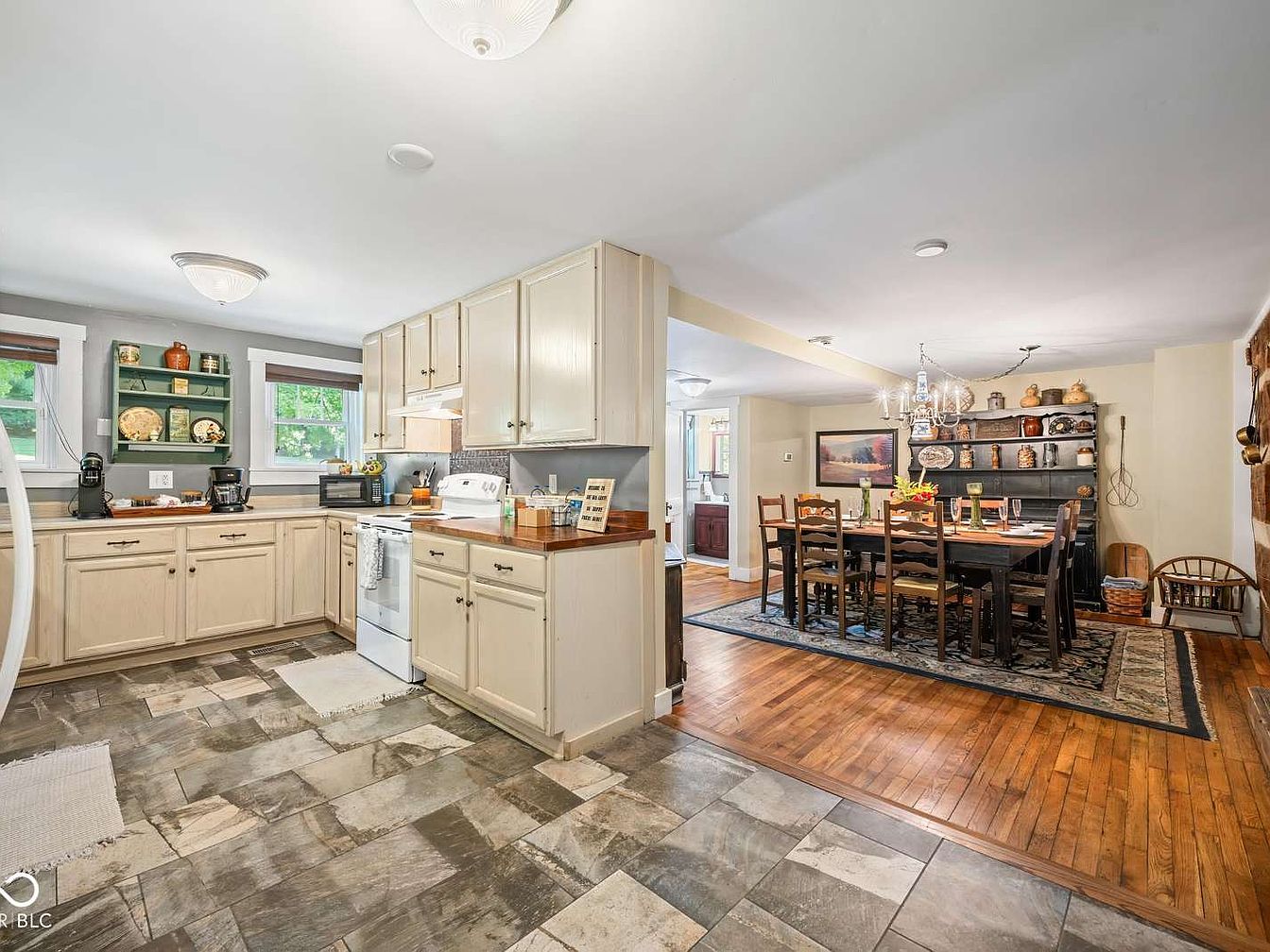 This open layout seamlessly blends a cozy kitchen and a formal dining room. The kitchen features cream cabinetry, rich wooden countertops, and stylish stone tile flooring. Decorative green shelves above the counter display plates and pottery, adding vintage character. Light from twin windows creates a bright, inviting atmosphere. The adjacent dining area has warm hardwood floors, a large wooden table surrounded by ladder-back chairs, and a patterned rug anchoring the space. A black hutch on the back wall showcases more antique ceramics, while a classic chandelier hangs above the table, enhancing the historic and welcoming aesthetic.