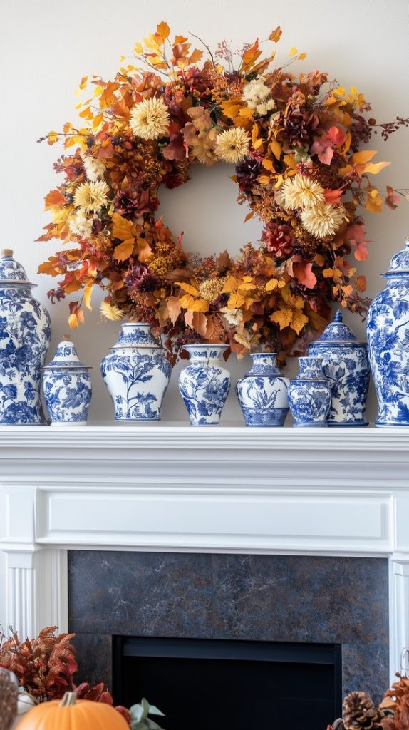 This mantle combines a traditional autumn wreath with blue accents, blending the warm oranges of fall leaves with cool blue vases and ceramics. The balance between warm and cool tones creates a fresh, sophisticated fall look, perfect for those who want to add a modern twist to classic fall decor.