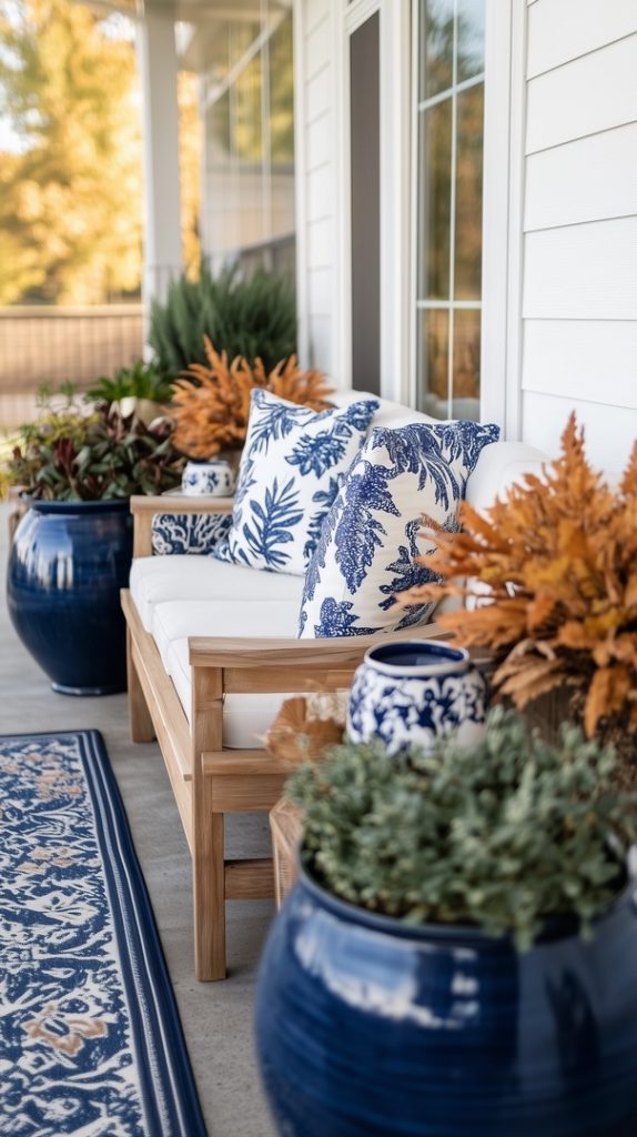 This porch scene welcomes autumn with cozy blue accents. Blue and white patterned cushions on a rustic wooden bench create a serene atmosphere, while a blue ceramic planter adds a vibrant touch. The addition of warm-toned fall leaves brings in the seasonal vibe, perfectly balanced against the cool blues. The natural wooden elements paired with soft cushions make this outdoor seating area ideal for enjoying crisp fall mornings or evenings, blending comfort and seasonal beauty seamlessly.