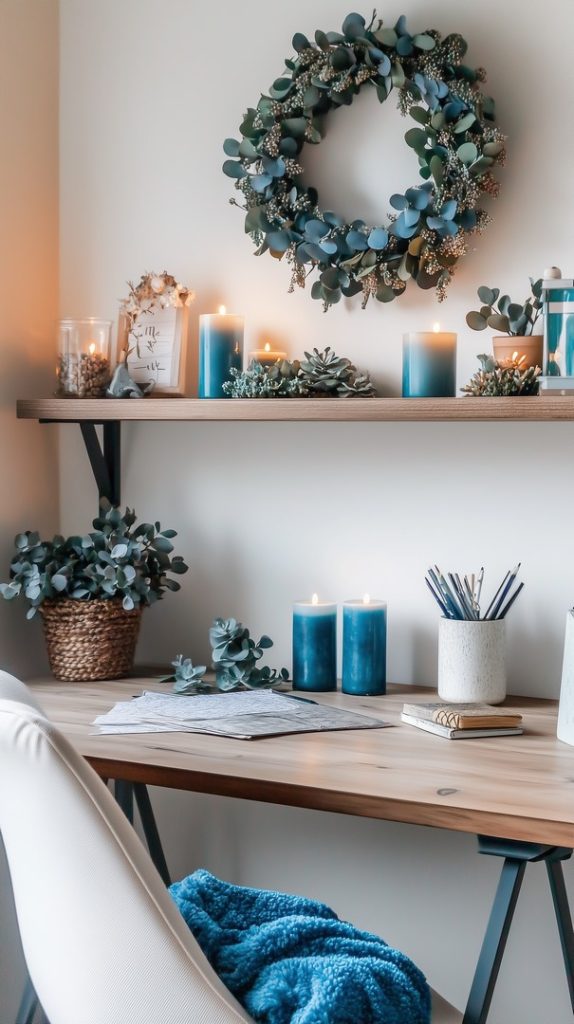 This simple yet elegant mantel decor features a minimal fall wreath and candles paired with blue glass vases. The clean lines and cool tones create a serene atmosphere for autumn.