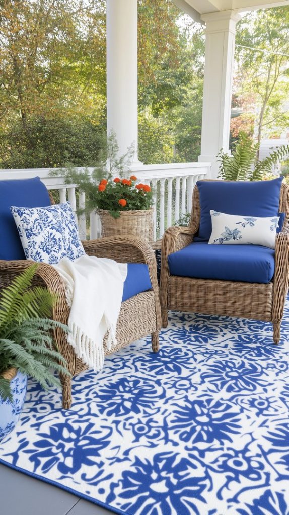 This outdoor patio area is designed for fall relaxation, featuring a mix of blue and orange tones. A woven wicker coffee table sits atop a blue patterned rug, complemented by blue and white cushions. The bright orange throw blanket adds warmth and vibrancy to the seating arrangement. This setup offers a perfect retreat for enjoying the changing season, with the combination of cool blues and warm oranges creating a balanced, seasonal aesthetic.