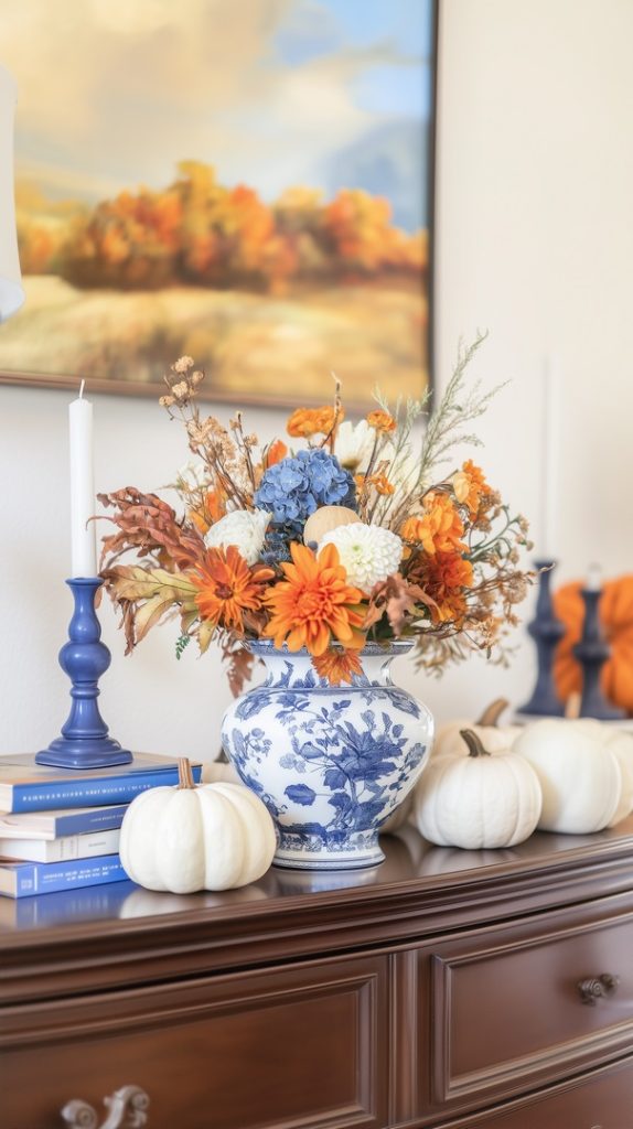 A stunning centerpiece featuring blue and white vases filled with autumn florals. The fresh arrangement is perfect for a fall dining table, combining classic elegance with seasonal charm.