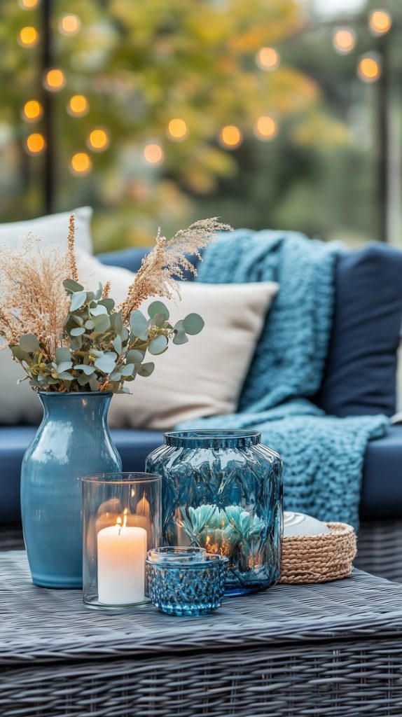 A warm and cozy outdoor seating area adorned with fall decor, including blue accents, candles, and soft blankets. The setup is perfect for enjoying cool autumn evenings outdoors.