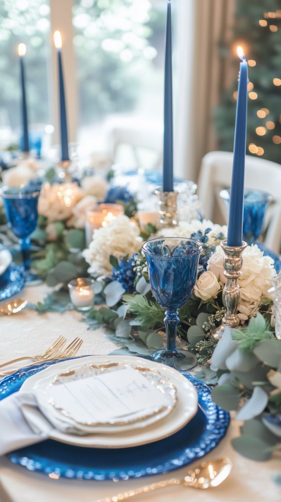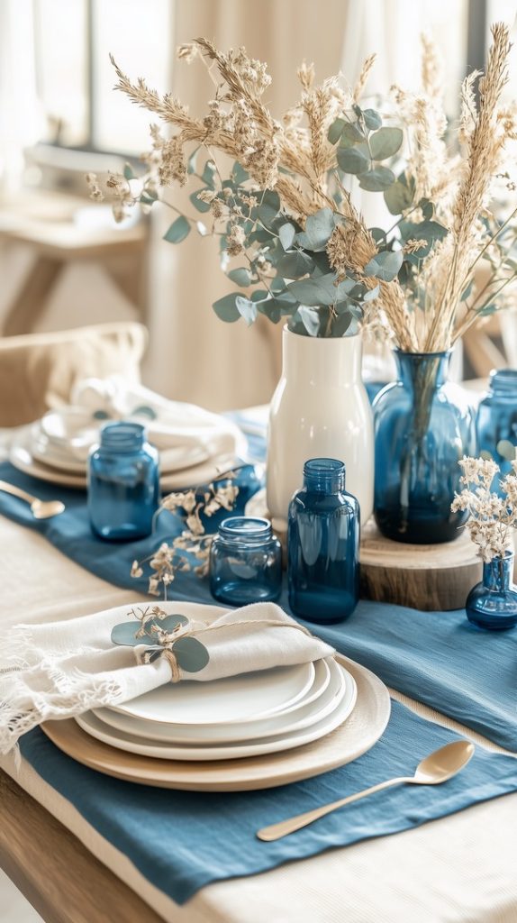 Elegant Fall Table Setting with Blue and Gold Accents