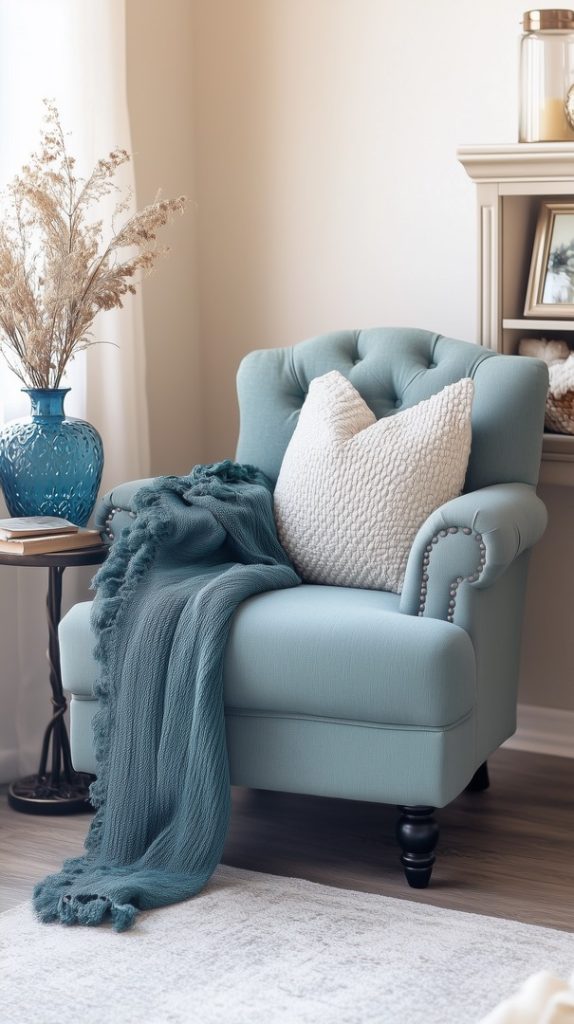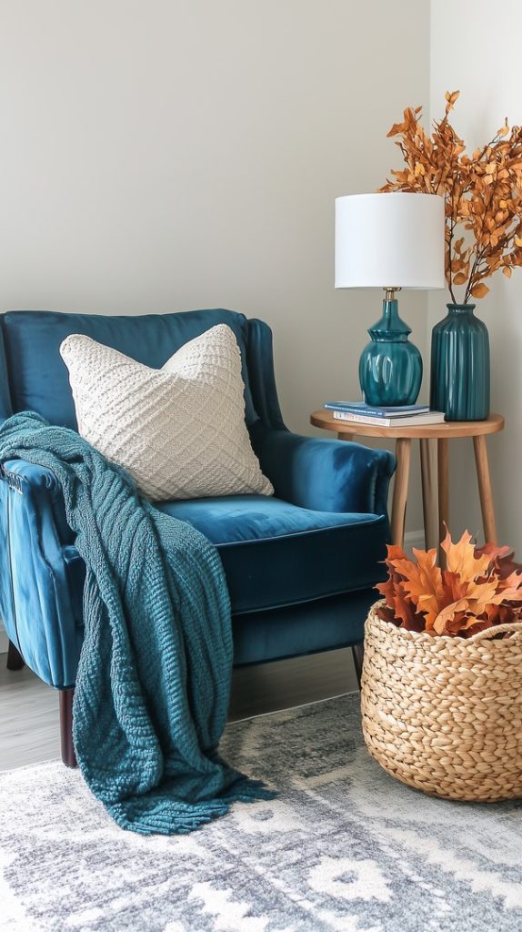 A charming reading nook styled for fall with a cozy blue throw, autumn florals, and neutral-toned cushions. The space feels calm and inviting, ideal for a quiet moment during the autumn season.