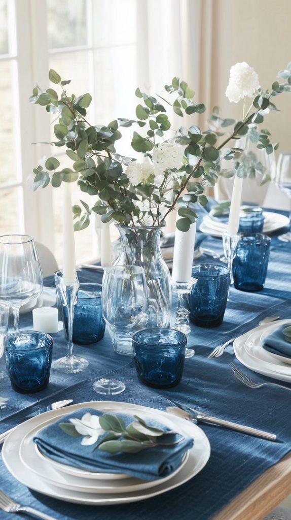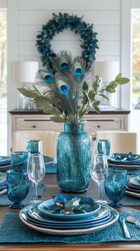 Peacock Feather Tablescape with Blue Glassware