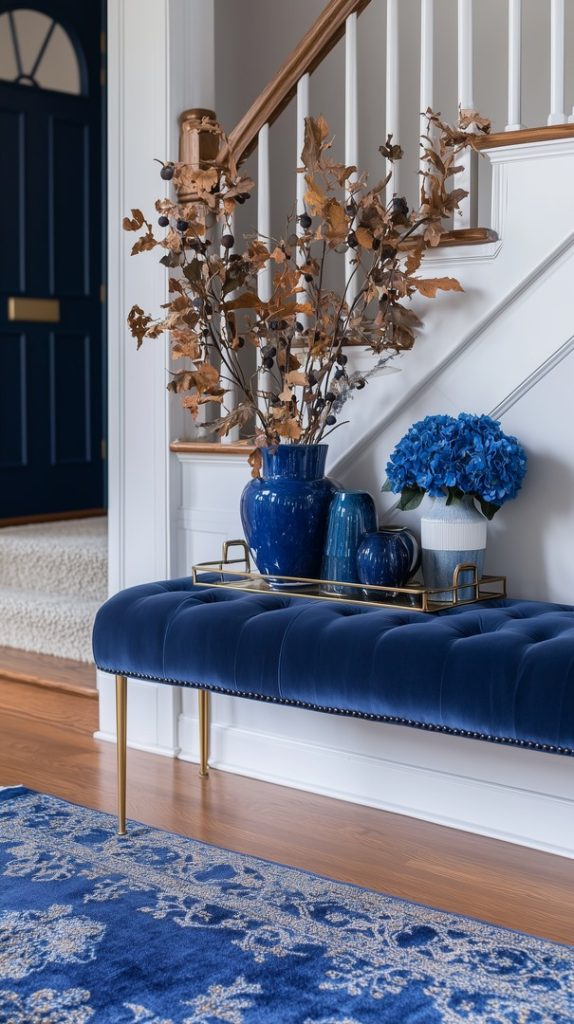 A beautifully decorated stairway for fall with rich blue cushions, pumpkins, and dried foliage. The combination of modern blue tones with natural elements creates a welcoming and stylish entryway for autumn.