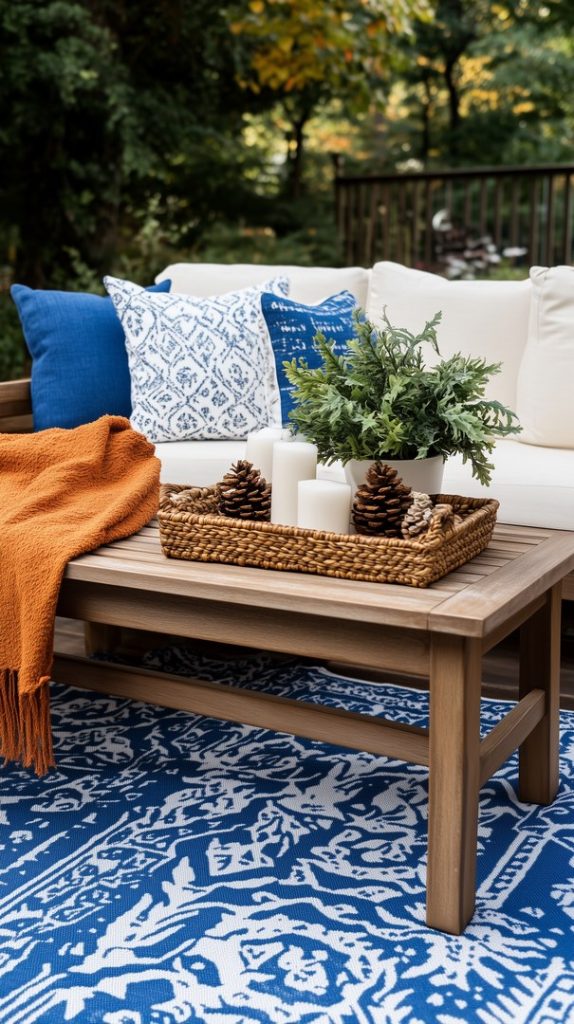 Inviting Outdoor Fall Decor with Blue Cushions