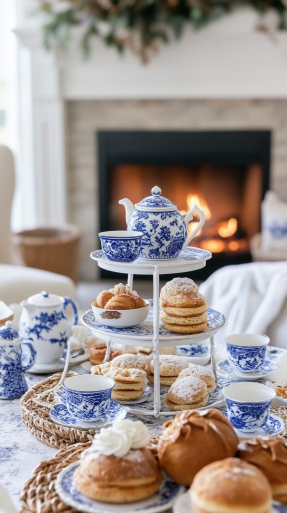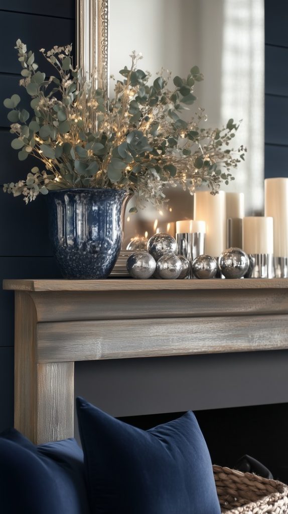 Elegant Blue Mantle with White Pumpkins