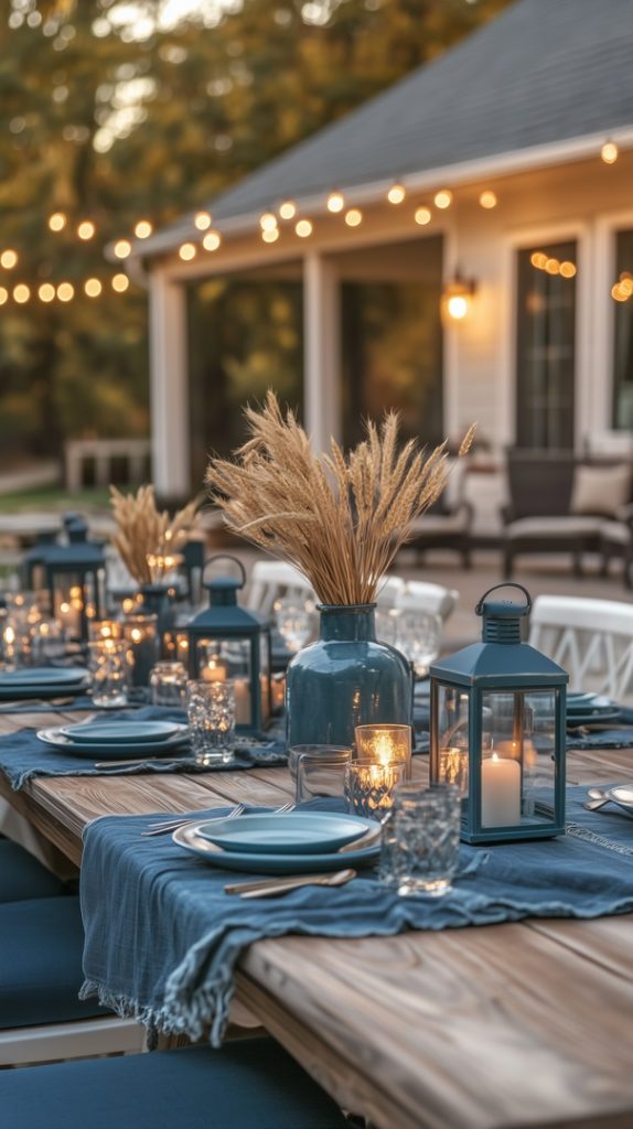 Outdoor Fall Dining with Blue Table Linens