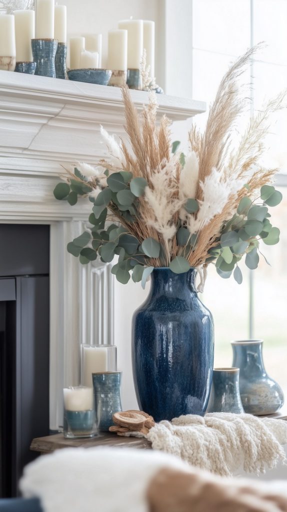 A modern fireplace styled for fall with blue vases, dried florals, and neutral decor. The simple, clean design creates a serene and cozy atmosphere for the cooler autumn months.